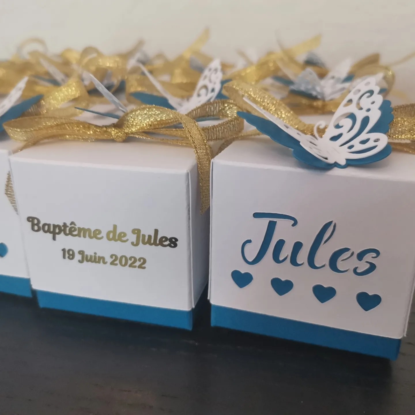 cette boite de dragées se compose d'un couvercle contenant le prénom de l'enfant en découpe , un papillon double découpe " simple + dentelle " la date est sur le dos de la boite et écris en dorure .