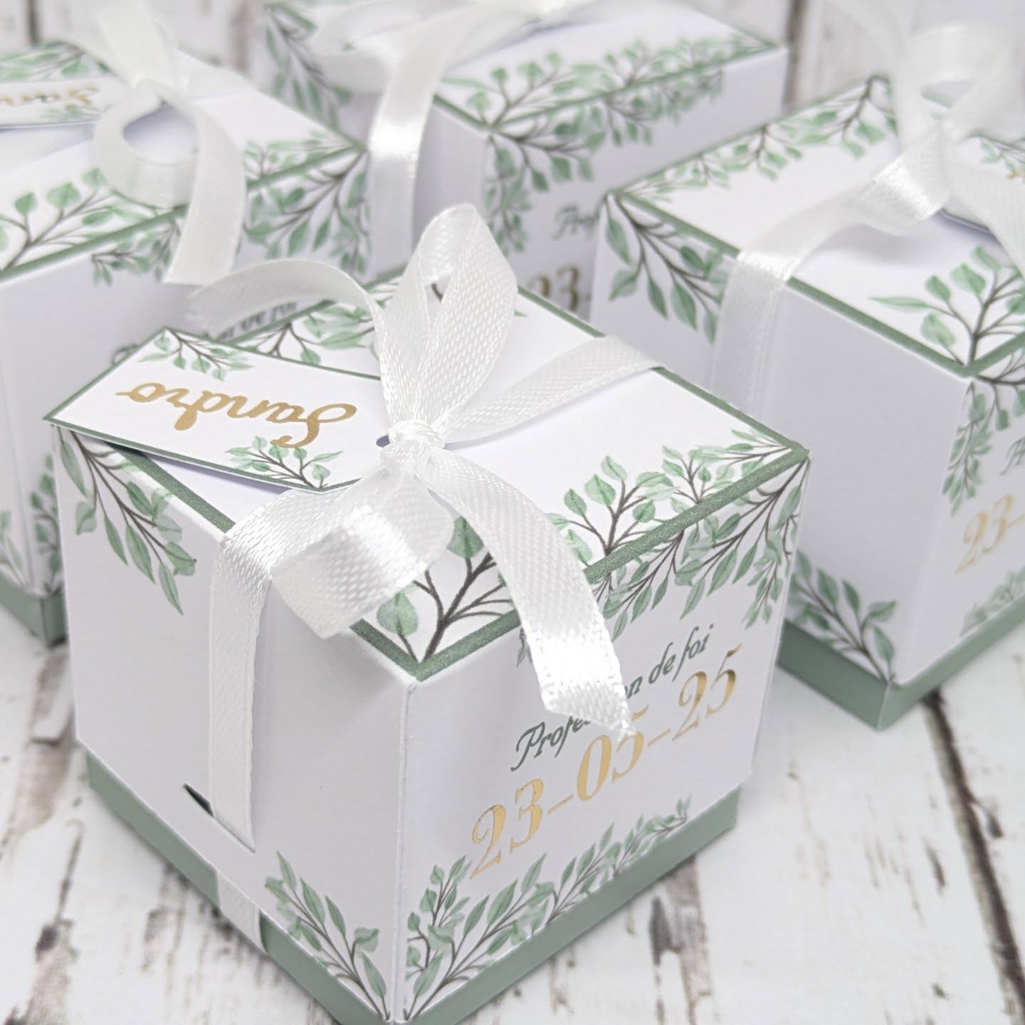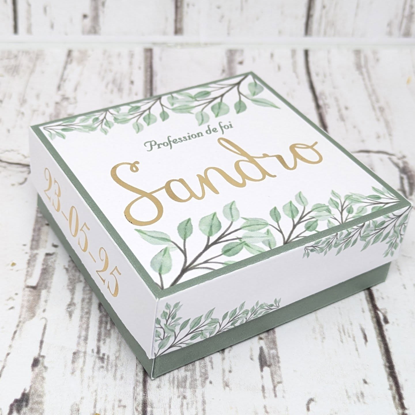 la boite est constituée d'un support de couleur verte imprimé sur l'exterieur seulement, avec un rabat blanc à motif feuillage, il arbore un ruban blanc et une petite étiquette qui portera le prénom de votre enfant écrit en dorure.