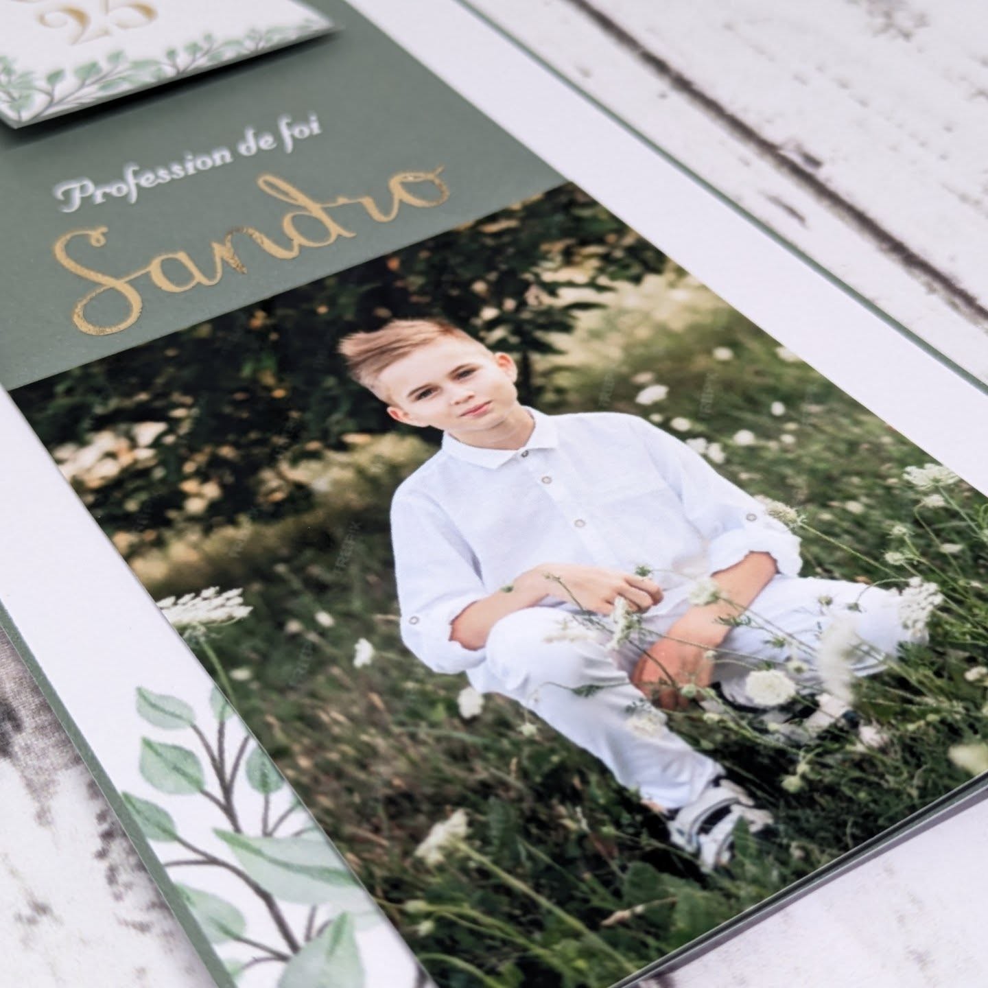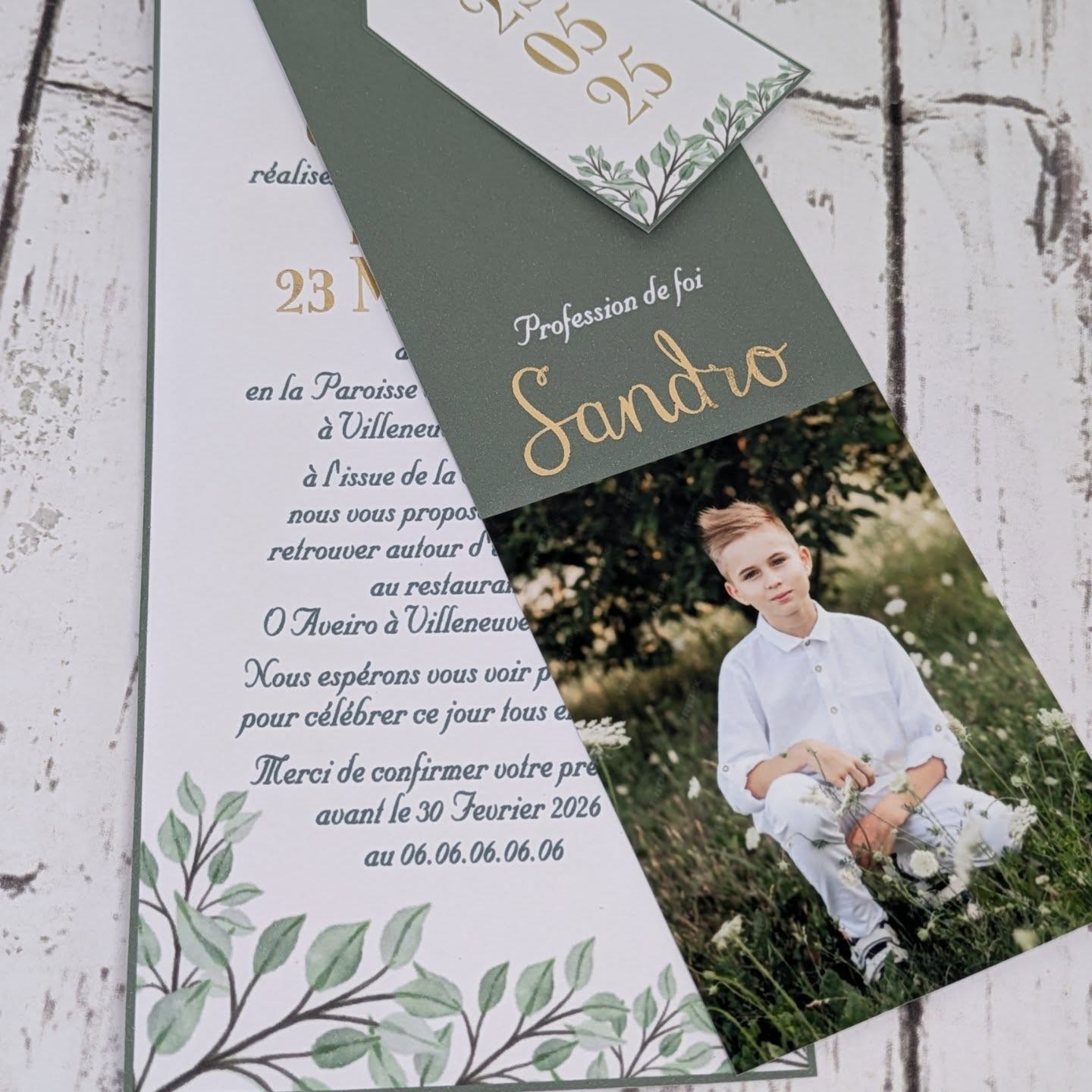 Personnalisez le faire-part baptême "Soft Greenery" pour inviter tous vos proches à la cérémonie de communion ou tout évènement de votre enfant.