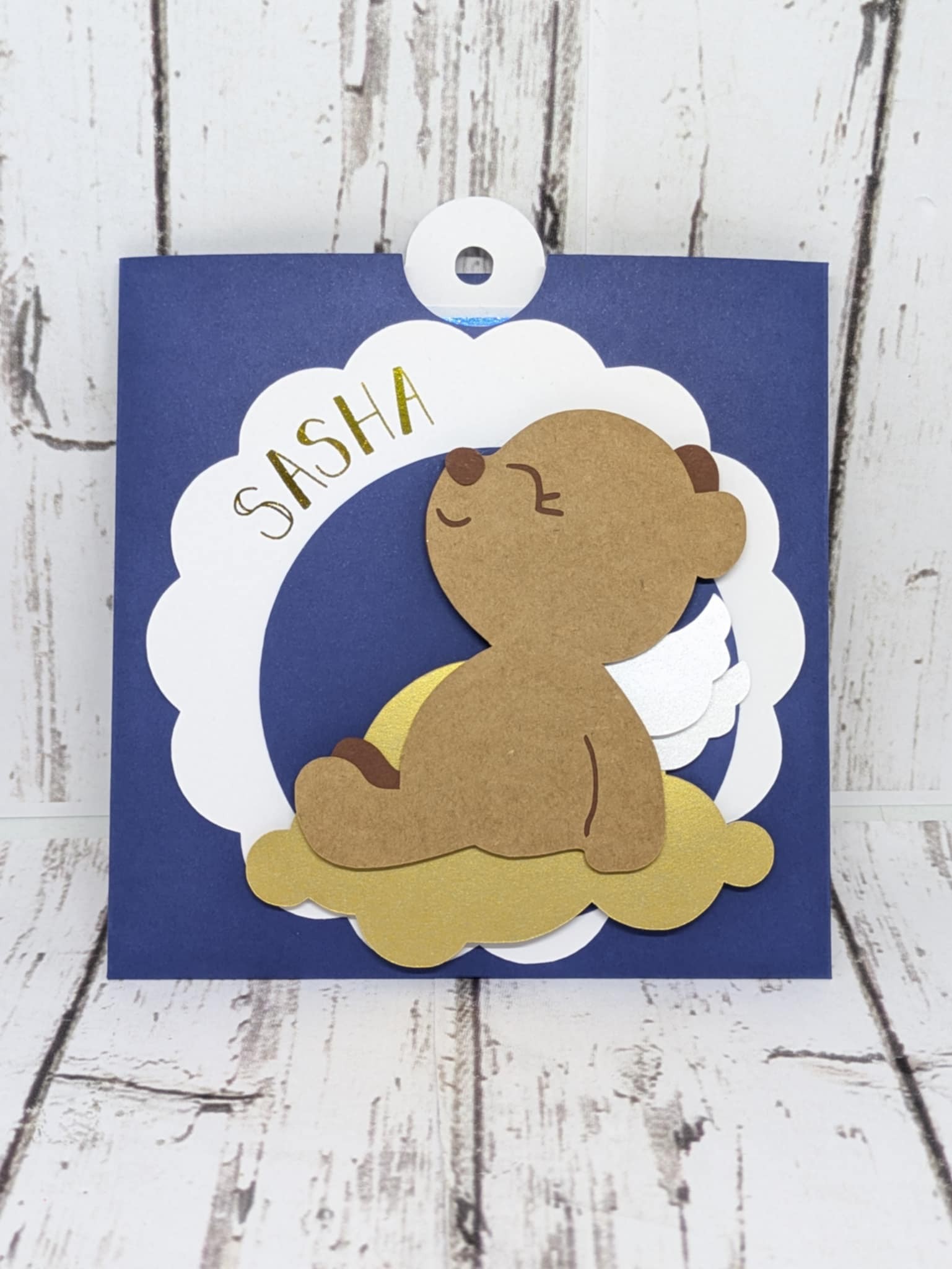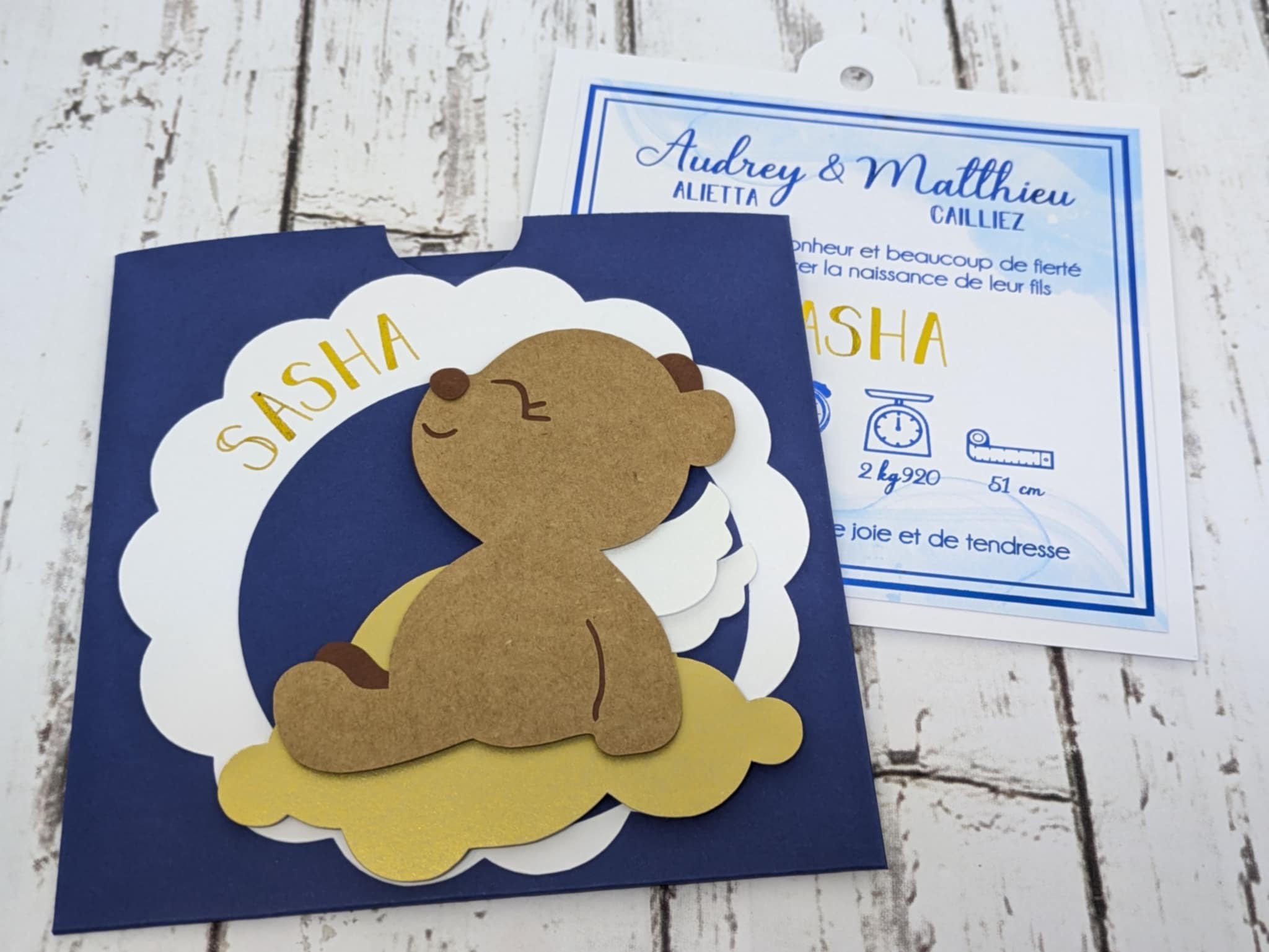 Faire part naissance ours ange sur nuage en 3D découpé dans plusieurs feuilles de papiers de couleurs différentes