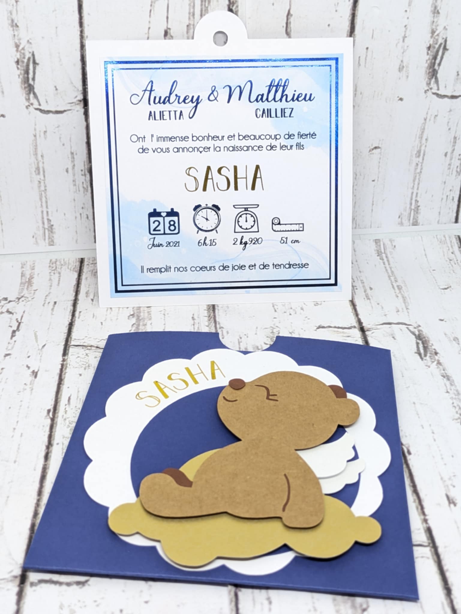 le texte est de votre choix. une photo de votre enfant peut être ajouter au dos du faire part. elle sera transmise par mail avant ou après votre commande a Klozcustom@hotmail.com